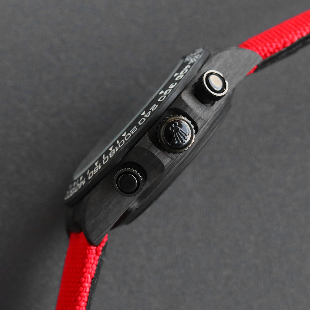 宇宙计时迪通拿系列之碳纤维定制版,腕表不仅佩戴轻便,外表坚硬。且每一只腕表都拥有独一无二的碳纤花纹材质。 【表壳】腕表尺寸40X12.4吻合原装。实力铸造碳纤维劳力士的独特风采。市场独家做到,整个壳套,圈口包括底盖均采用高复合碳纤维和超强夜光粉所打造。细节之处更是经过手工倒角抛光所制。质感非凡。【表带扣】表带采用人工纤维编织带所制,透气舒适,质地柔软。【机芯】采用最新精准而成熟明珠机芯,完美实现强大功能,性价比之王!!!